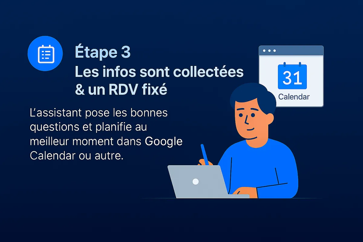 On vous aide à connecter votre numéro, vos e-mails et votre calendrier, puis on entraîne l’assistant à répondre exactement comme vous le souhaitez.