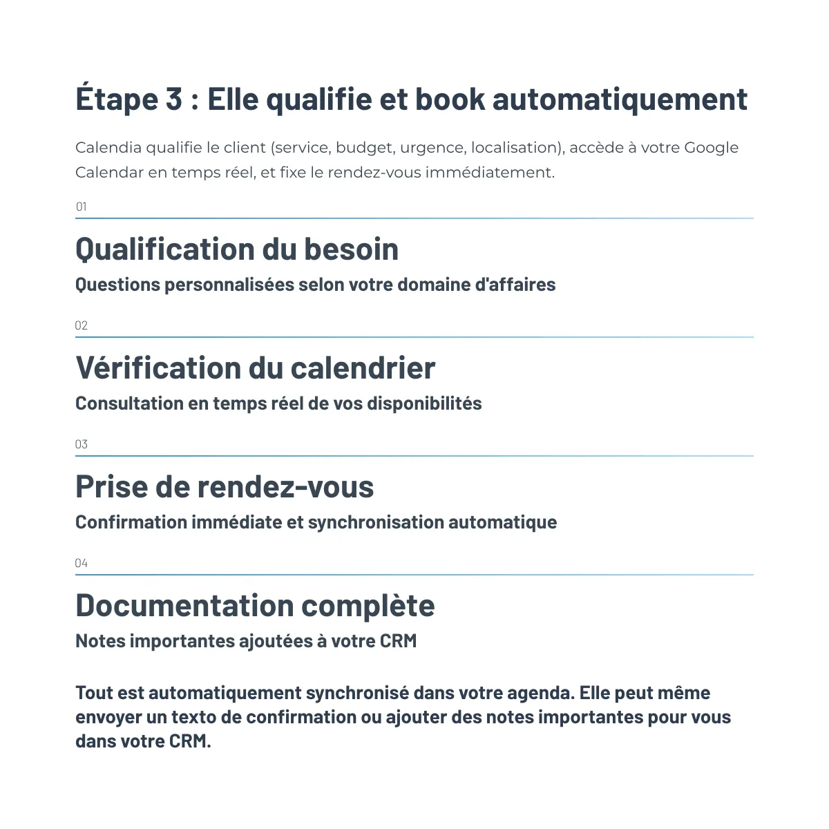 Calendia peut se présenter comme votre assistante (ex. : “Bonjour, ici Julie de chez Plomberie Michel Lacoste”).